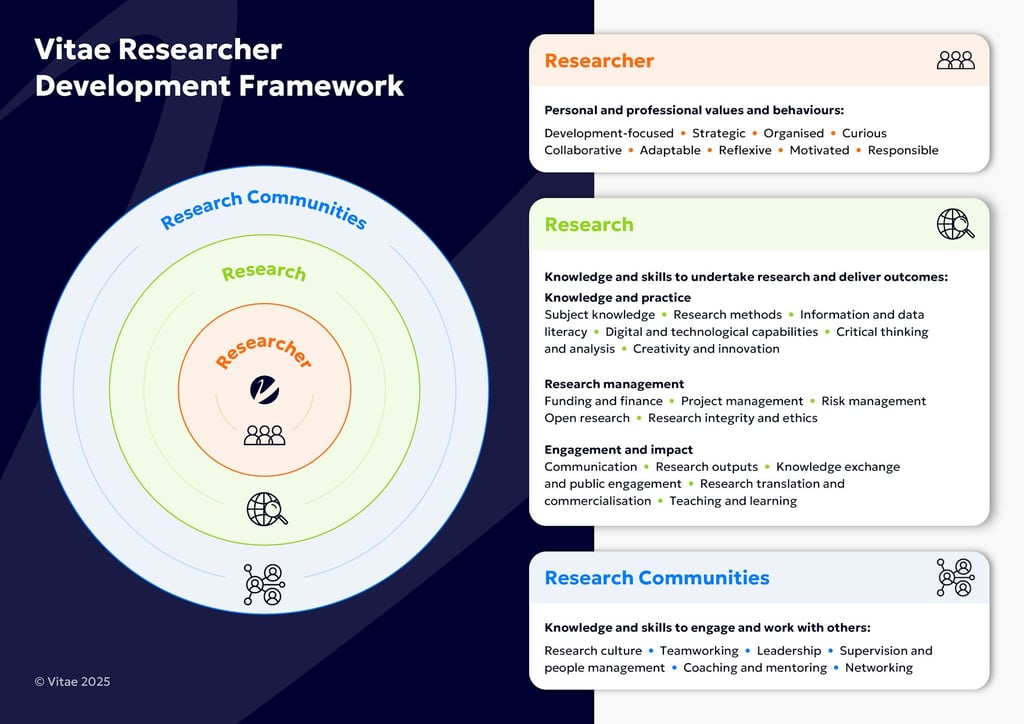 Research strategists can use these training events to foster an ambitious, public-facing and nurturing research culture at their university based on Vitae's latest map of competencies in the 2025 RDF.